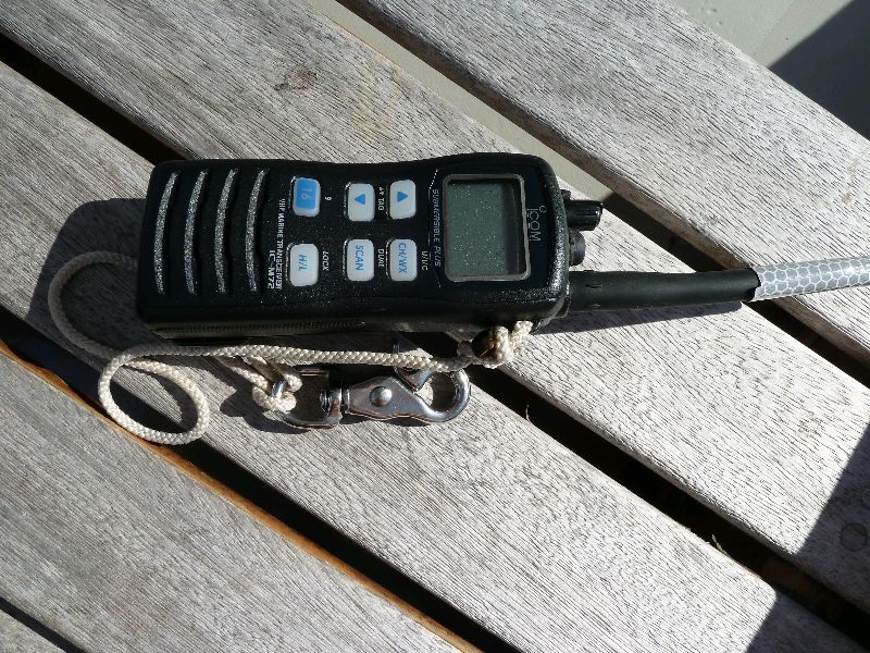 Oberndorf, Osteland. Der zweite Schritt in der Sicherheitsausrüstung ist ein wasserdichtes Seefunkgerät. Tragen wir auf See immer mit uns rum. Der (oder die), der über Bord fällt, kann dann den anderen wecken und auch später einweisen (“etwas mehr Backbord und dann 200 m geradeaus”). Noch einmal: Einen Überbordgefallenen bei Nacht wiederzufinden ist ohne solche oder andere Hilfsmittel fast unmöglich. Wenn alles schief geht, kann der ‘Fußgänger’ mit dem Funkgerät auch andere Hilfe holen, Mayday rufen. Sea u Bert