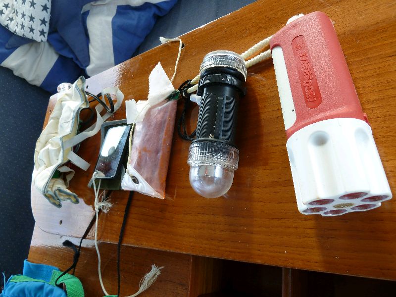Oberndorf, Osteland. Außer Schwimmwesten, mit Schrittgurt und Spraycap, tragen wir in See bei schlechtem Wetter und grungsätzlich nachts zusätzlich eine kleine Tasche mit folgendem Inhalt: Eine Kappe zum Schutz gegen Auskühlung über den Kopf, die außerdem stark reflektiert; einen Signalspiegel; eine Tüte mit Seewasserfärber, der einen 100 qm großen grünen Fleck auf dem Wasser macht; ein Stroboscope Blitzlicht und ein Nico Signal zum Abfeuern von 6 Leuchtkugeln. Wir werden oft gefragt, ob das alles nicht etwas unbequem sei. Ja, Sicherheit ist immer unbequem. Diese kleinen Taschen stören uns aber kaum. Man (und Frau)gewöhnt sich dran. Sea u Bert