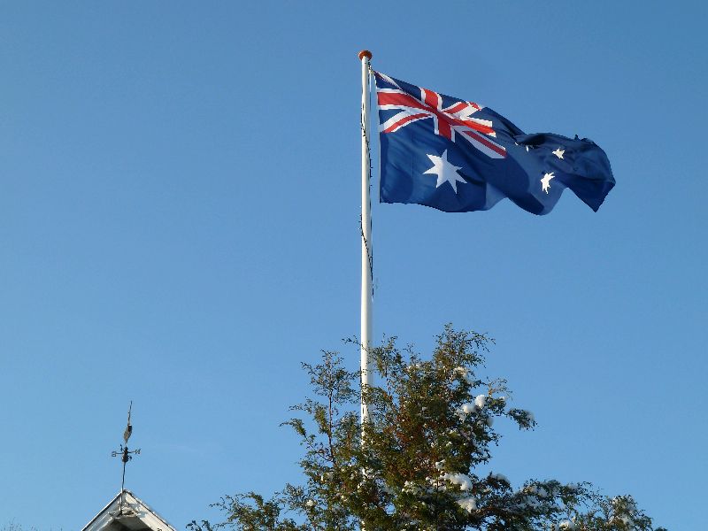 Oberndorf, Oste. Für die Crews von Momo und Thule, die den ganzen Weg nach Neuseeland gesegelt sind, haben wir heute in Oberndorf die Australische Flagge gesetzt. Die Neuseeländische haben wir leider nicht, sie unterscheidet sich jedoch nur durch die Farbe der Sterne. Die sind in der Neuseeländischen rot. Wenn Ihr etwas bunt denkt, geht das schon. Vor beiden Besatzungen und ihren Schiffen ziehen wir den Hut ob dieser Leistung. Sea u Marlene und Bert