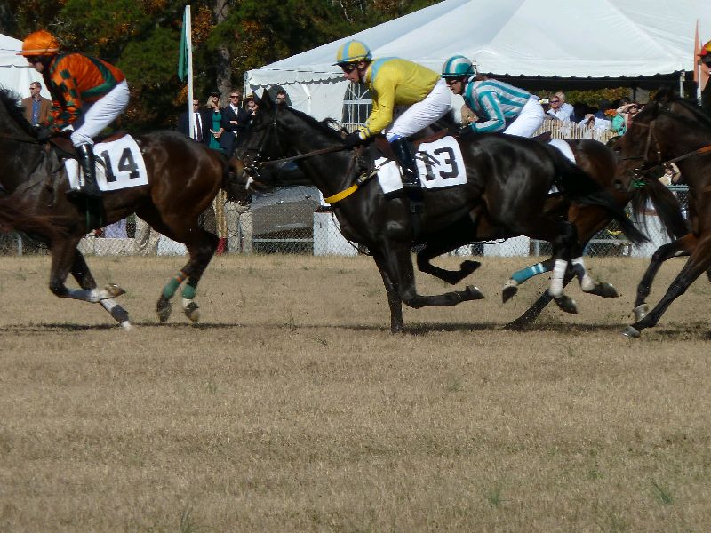 Camden, South Carolina, USA. Wirklich keine Wolke am Himmel seit Tagen, aber Nachtfrost. Die dreistündige Fahrt nach Camden durch die Indian Summer Wälder war ein Erlebnis. Ein schöner Tag auf der großen Wiese neben der Rennbahn. Leckeres Buffet-Futter und fein schnacken, den ganzen Tag mit netten Leuten, alten Freunden und herrlichstem Sommerwetter. Da ich kein Freund des Glückspiels bin, hab ich auch nur einen Dollar gesetzt und erwartungsgemäß verloren. Und das, obwohl mein Pferd frühzeitig ins Ziel kam, bedauerlicherweise jedoch ohne Jockey. Sea U Bert