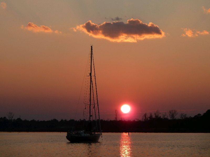 Oriental, North Carolina, USA. Ein Abend wie Samt und Seide. Der Ort gefällt uns sehr, nette Leute überall, immer wieder halten sie an, um uns mitzunehmen. PJOTTER vor uns im Sonnenuntergang und hübsche Krabbenkutter. Dennoch. Is sowiet. Morgen geht’s weiter, ein kurzes Stück Intracoastal und dann in den Atlantik. Das Wetter soll brauchbar werden. Auf halber Strecke nach Charleston liegt das gefürchtete Cape Fear, das Kap der Angst. Aber Oberndorf mit seinem Weihnachtsmarkt kommt näher. Sea u Bert