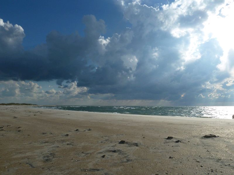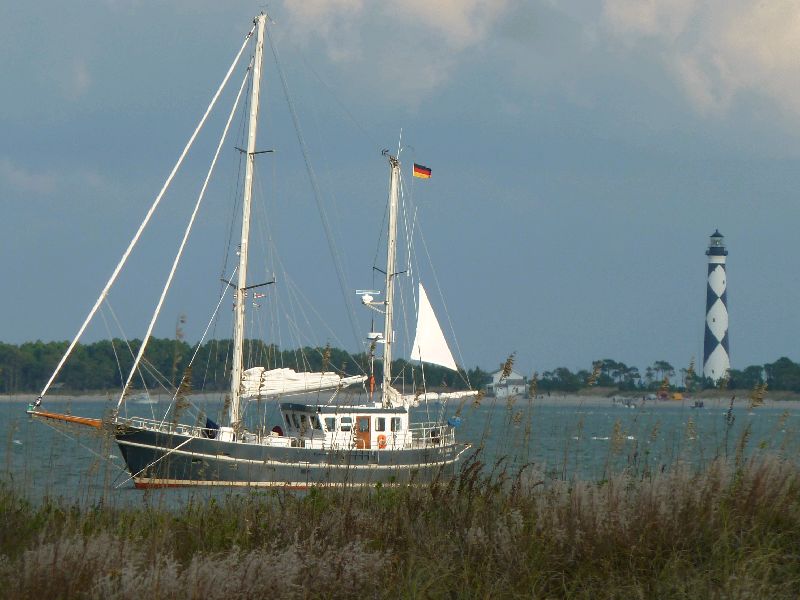 Vor Anker, Lookout Bay, North Carolina, USA. Eine Strand- und Dünenlandschaft wie auf meiner Geburtsinsel Borkum. Ein idealer Platz für Leni, um noch mehr Muscheln zu finden. Gegenüber der mit seinem Rautenmuster markante Lookout Leuchtturm, der die Schifffahrt vor einem der gefährlichsten Kaps warnt. Über 800 Wracks sollen hier vor Kap Lookout liegen, nur ein Teil davon durch deutsche U-Boote versenkt. Wir liegen hinter dem Leuchtturm in einem einsamen Naturhafen, gut geschützt. Trotzdem pfeift’s ganz ordentlich, und wir werden unser Auslaufen von hier wohl auf den Sonntagnachmittag verschieben, da soll es von 6 auf 5 Windstärken abflauen. Sea u Bert