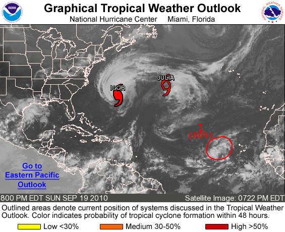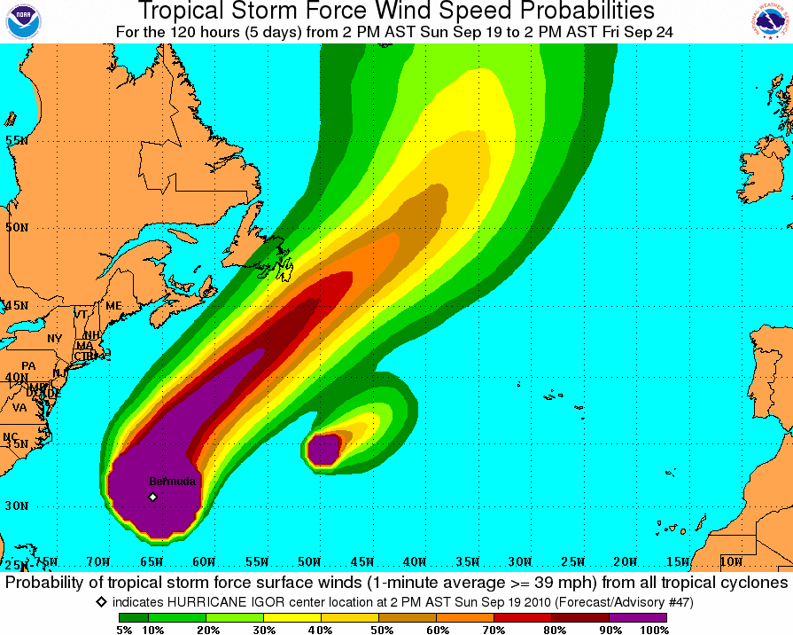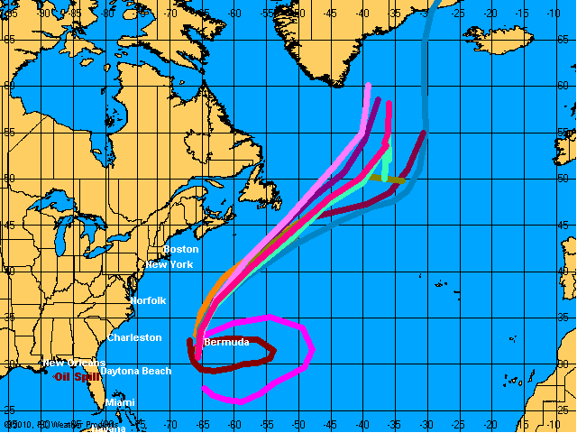 Newport, R.I., USA. Eigentlich sogar zwei Hurricanes. IGOR und die kleine JULIA. Wieder sind sie nicht richtig weit weg von uns. Dennoch weiter als damals EARL. Das Bild mit den bunten Linien nennt man Spagettimodell. Da wird die Zugbahn des Hurricanes nach verschiedenen Modellen errechnet. Wir sind sicher, dass beide vorbeiziehen. Sea U Bert