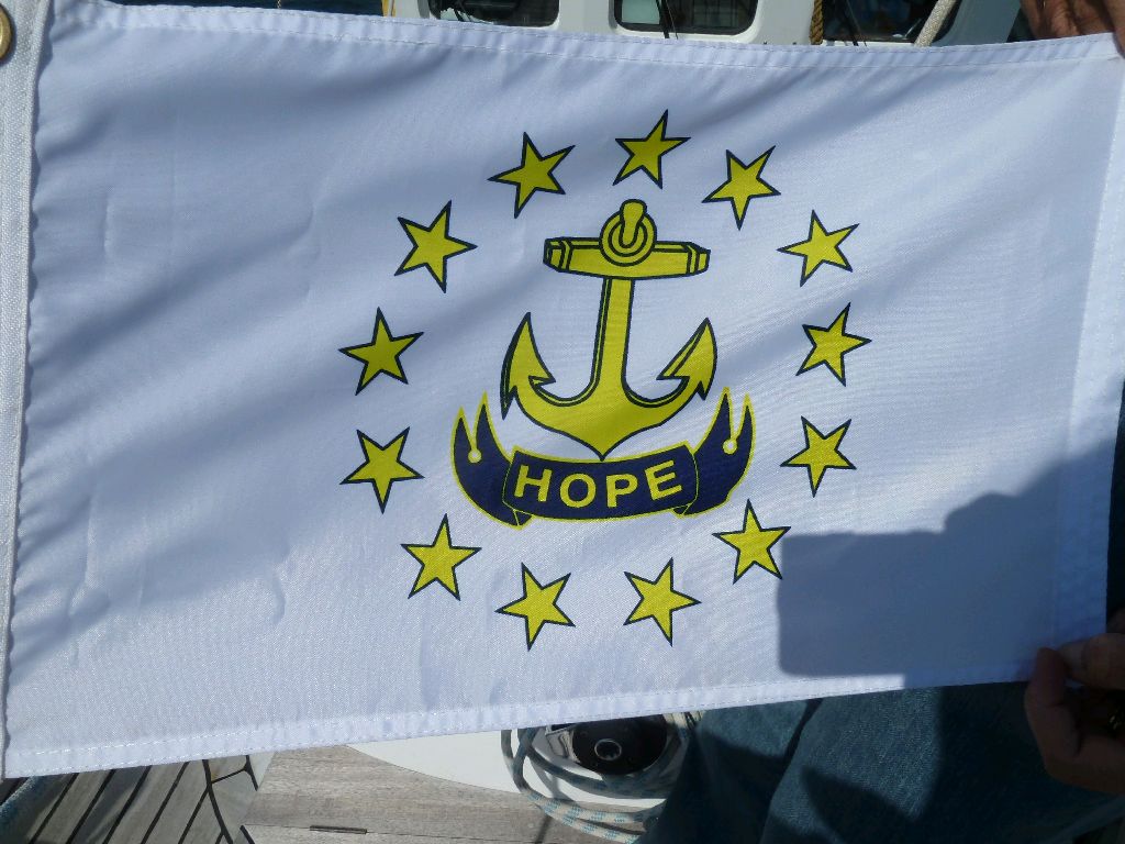 Newport, Rhode Island, USA. Dies ist die Flagge vom Saat Rhode Island. Auf den Autonummernschildern steht ‘Ocean State’. Die Staatenflaggen sind nicht so leicht zu kriegen hier. Einige fehlen uns noch. Sea U Bert