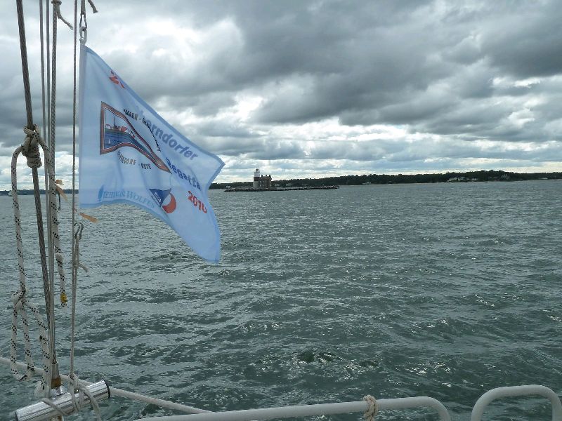 Long Island Sound, Connecticut, USA. Das westlichste aller Regatta-Begleitboote für die 20ste Oberndorfer Regatta ist schon seit gestern auf Position Long Island Sound. Ja wenn die Oberndorfer so richtig Gas geben, und dann noch der Ebbstrom auf der Elbe, dann sind die schnell hier drüben. Na, und da es hier auch schon herbstlich ist, gibt’s auf der Heimkehr zur Begrüßung einen Osteland-Aquavit. Auf dem Bild der Leuchtturm ‘Execute Rock’. SeaU Marlene und Bert