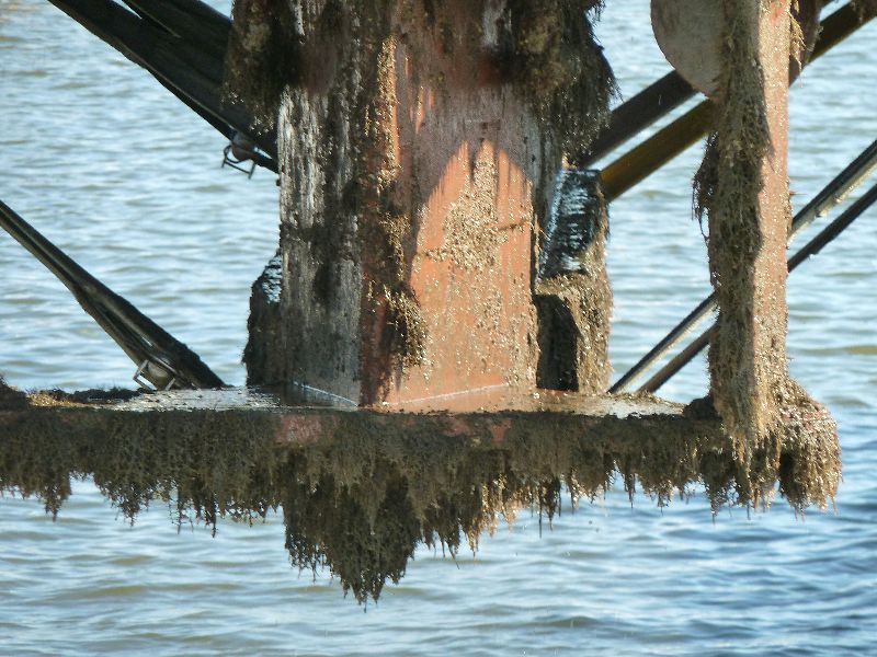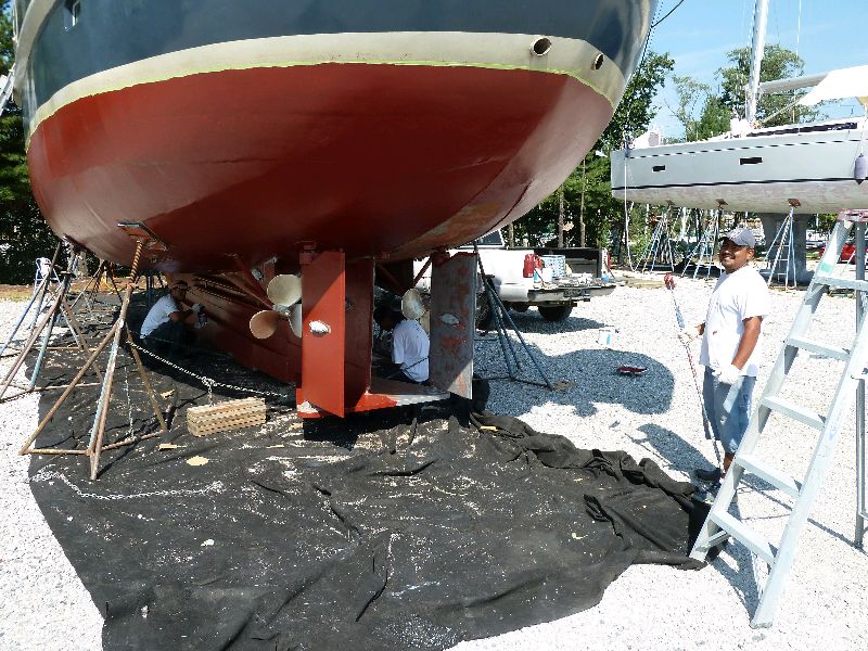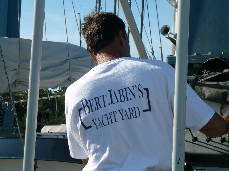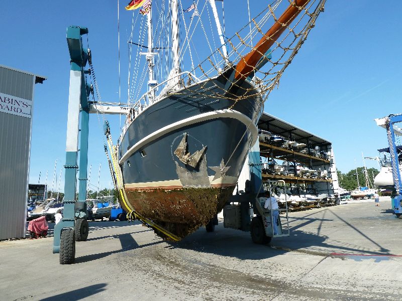 Annapolis, USA. Das warme Brackwasser konnte unser Unterwasserschiff nicht so gut ab. Der Zottelbart ist sehr schnell gewachsen. Eine große Werft mit vier Liften und etwa 10 Firmen für alle denkbaren Gewerke im Gelände. Chef hat einen sympathischen Vornamen: Bert. Alles pieksauber, das Slippen sehr professionell, so wie in Glückstadt. Nun liegen wir mit der Nase im Wald. Morgen kommt die neue Farbe drauf, geschliffen und ausgebessert ist schon. Übermorgen wollen wir wieder ins Wasser. SeaU Bert