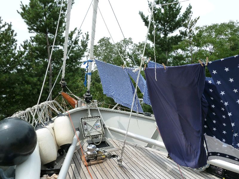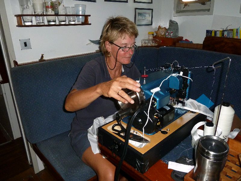 Annapolis, Bert Jabins Yacht Yard, USA. Seit über 15 Jahren wollten wir schon eine Nähmaschine von SAILRITE haben. Jetzt steht sie an Bord, ist ziemlich schwer (25 kg) und unsere Pantry ist jetzt keine Wohnküche mehr, sondern eine Nähküche. Erste Übung: die Reparatur von Berts Arbeitshose und ein neuer Windcatcher für die Vorschiffsluke. Bin begeistert, schwere Stoffe und dicke Nähte sind überhaupt kein Problem mehr. ////// ZickZack-Marlene