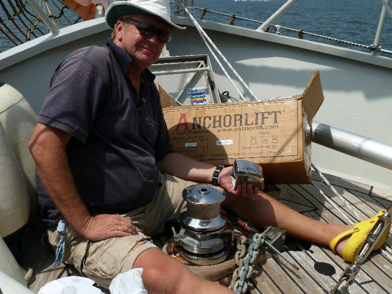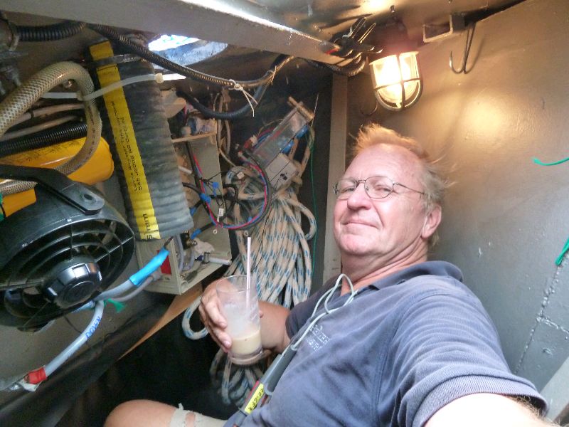 Annapolis, USA. Mein neuer Lieblinbgsplatz, die Kettenlast. Leider ist das Schiff in diesem Bereich nicht isoliert, so konnte ich auch nicht frieren. Waren inmmer knapp unter 40 Grad in dem Backofen. Die Relaisbox mußte neu und die elktrischen Anschlüsse anders. Morgen kommt Mike, morgen wird sie eingebaut. Leni hat Eiskaffee gemacht, das half. SeaU Bert