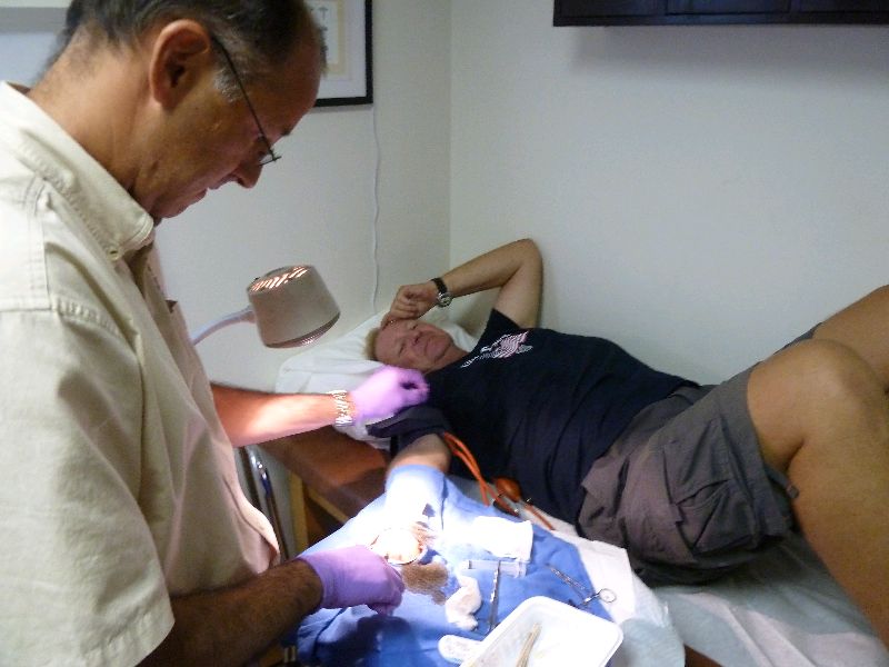 Annapolis, USA. Die gute Nachricht ist, dass wir die Ankerwinsch nun mit Andreas Telefonseelsorge zum Laufen bekommen haben. Danach wollte ich in meinem neuen Lieblingsarbeitsplatz Kettenlast etwas Holz abstechen, um den Schaltkasten zu versetzen. Stecheisen auf Heimkehr sind scharf. Abgerutscht, Stecheisein in den Arm, da wo man den Puls fühlt. Erste Hilfe von Leni mit Druckverband, dann sehr schnell an Land. Ein Hafenmeister, den wir nach dem Hospital gefragt haben, hat seine Kollegen alamiert, und es stand schon einer auf der Pier, der uns zu einer nur 80 m entfernten Notfallpraxis gebracht hat. Dort wurde genäht, und da wir ein blaues Schiff haben, mit blauem Garn. Festpreis für sowas 200 $. In Amerikas Segelmekka hat sogar der Aeskulapstab ein Segel. Ich habe sehr viel Glück gehabt. Nun hab ich frei, sitz hier rum und guck Leni bei der Arbeit zu. SeaU, Bert