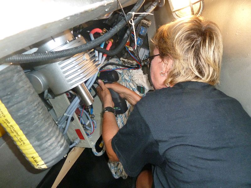 Annapolis, USA. Nachdem ich nun meine rechte Hand nicht mehr so gut gebrauchen kann, ist heute Leni in die Kettenlast eingefahren. Dort hat sie weitergemacht. Löcher gebohrt, Gewinde geschnitten , Schaltkasten versetzt. Olaf wird stolz auf sie sein. Ich armer Kerl musste unentwegt Werkzeuge heranschleppen. Natürlich hat sie sich nicht so blöd angestellt wie ich und ist unverletzt wieder an Deck erschienen. SeaU Bert