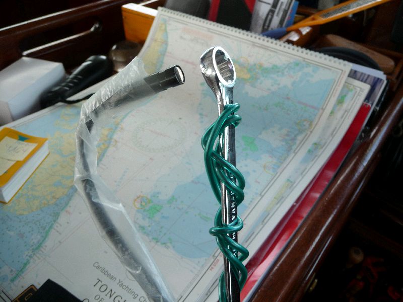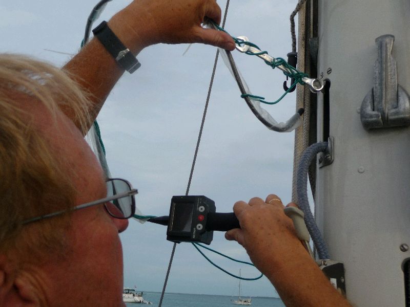 George Town, Grand Exuma, Bahamas. Eine Reparatur im Mast: Von der Schiene am Mast, die die Passatbäume aufnimmt, ist ein Stück abgetrissen. Die 8 mm Gewinde sind herausgerissen. Mit dem mit Blumendraht geführten Schlüssel, der mit einer Mini-Videokamera geführt wird (Endoskop,) ist es gelungen, eine Schraube durchzustecken und von innen mit einer Mutter und Scheibe zu verbolzen. Dies ist natürlich sowieso die bessere Verbindung verglichen mit dem ins Alu geschnittenen Gewinde. Wie sagt Hannes von ‘Rasmus’ immer: Ja das ist segeln!. Liebe Segler, lauft nicht ohne Blumendraht aus.
