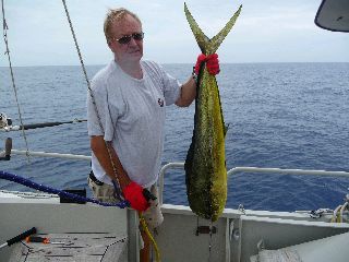 In See, Exuma Sound, Bahamas. Jetzt gibt’s wieder ein paar Tage Fisch. Diesmal ist uns ein Mahi Mahi, an den Haken gegangen. 1,25 meter lang und 8 kg schwer. Der größte, den wir je aus dem Wasser geholt haben. Nun haben wir einige Kilo Filet in der Kühlbox. Heute abend gehts erstmal mi gegrilltem Fisch los. Dazu möglichst wenig Kartoffel und oder Krautsalat. Bilder später. Sea u Bert
