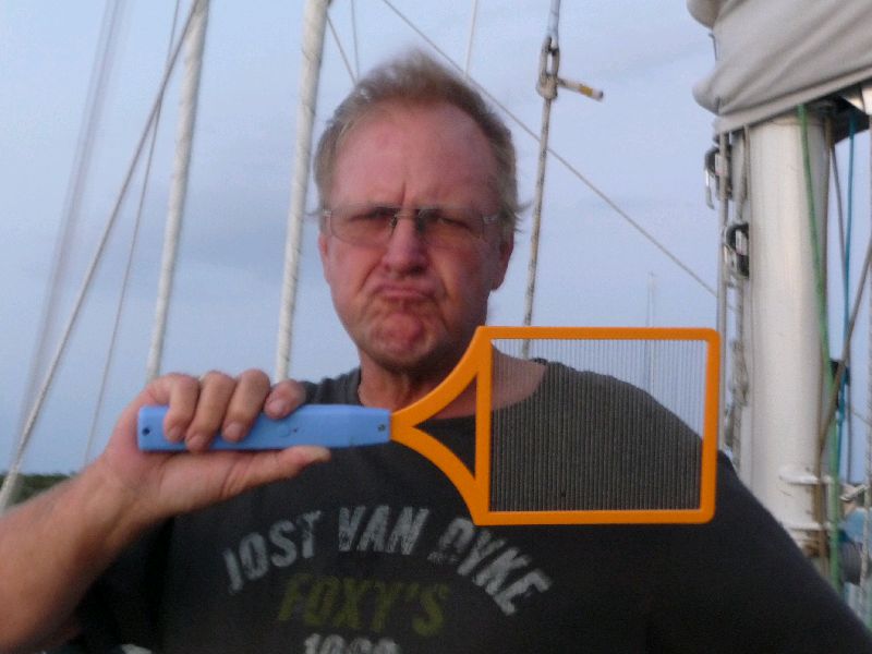 George Town, Bahamas. Wie ein Tennisschläger, im Griff ein Knopf, der die Bespannung unter Strom setzt. Damit schlägt man oder Frau nach der Mücke. Peng, Mücke k.o. So wie diese blauen Britzeldinger beim Metzger. Leni ist besonders gut mit ihrer Rückhand. Sea u Bert