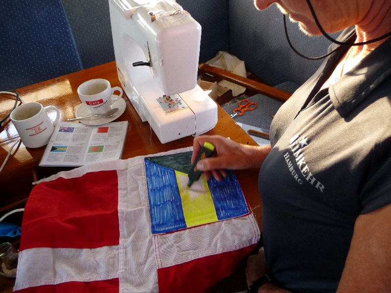 Die musste Leni nun sebst machen mit Hilfe der dänischen Flagge, Flaggentuch, Nähmaschine und Filzer.