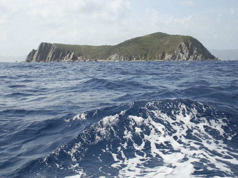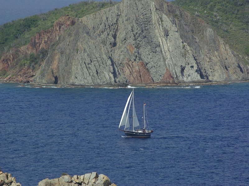 …auf des toten Mannes Kiste und ne Buddel mit Rum, Schnaps stand stehts auf der Höllenfahrtsliste….. Ein schöner zartfühlender alter Piratenshanty hat hier seine Wurzeln. Genau hier, auf dem Bild im Hintergrund der vorbeisegelnden Heimkehr, hat mein Namensvetter BlackBert 15 meuternde Piraten mit einem Fass Rum und einem Säbel ausgesetzt. Die Nachbarinsel ist nah, nützte aber wenig, weil er vorher jedem seiner Meuterer ein paar Eisenringe an die Füße schmieden ließ. Wegschwinmmen war nicht. Die Insel heißt bis heute ‘Dead chest’. Die Bucht, in der wir liegen ‘Dead Man Bay’. Was für ein Platz! Sea u Bert, ohne Black, und Meuterer hab ich zur Zeit gerade nicht. ____/)____