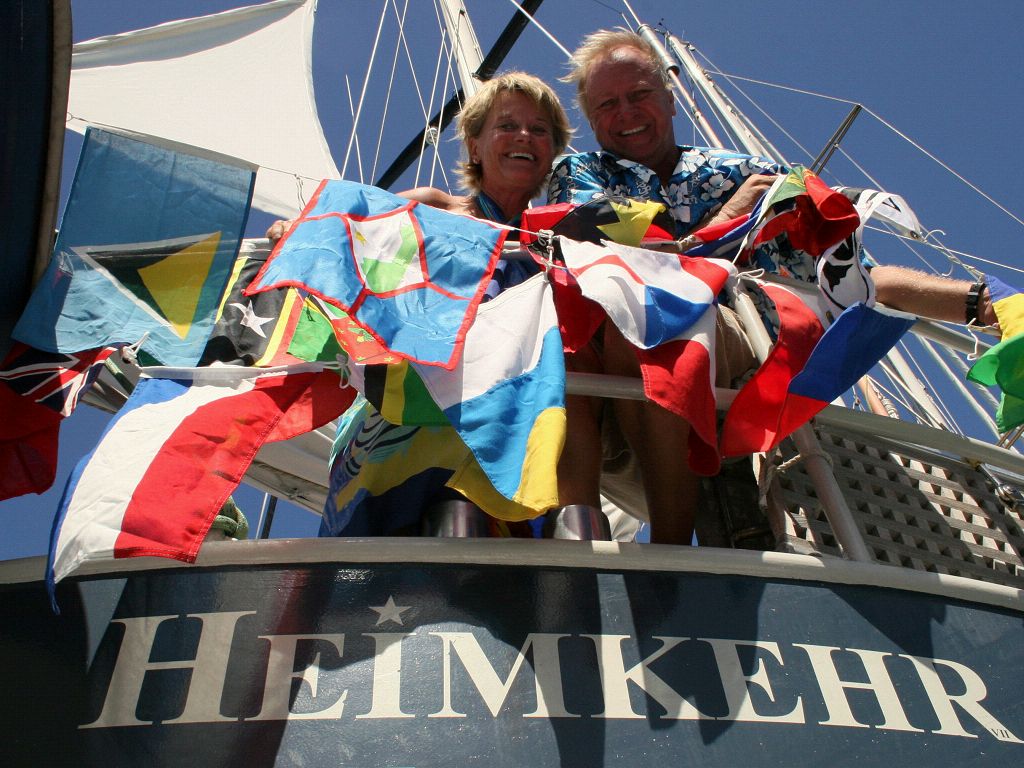 Am 16. Juni letzten Jahres wurden wir von unseren Freunden, besonders der SGO, mit großer Herzlichkeit in Oberndorf verabschiedet. Seitdem haben wir mit unserer Heimkehr auf dem Weg in die USA 6100 Seemeilen, entsprechend 11 300 km zurückgelegt. Eine Reise mit zahllosen aufregenden Erlebnissen und Begegnungen. Wir sind bestens klargekommen mit den Bewohnern all der Inseln und Staaten, die wir angelaufen haben. Ist alles wie zu Hause, bisschen schnacken muss man eben, dann klappt’s. ( siehe Bericht über Boatboys )Insgesamt 25 Gastlands flaggen wurden nacheinander unter der Steuerbordsaling gesetzt, so viele wie Staaten besucht wurden. Der kleinste und gleichzeitig schönste Staat war für uns Saba mit 1600 Einwohnern. Eine steile Felseninsel, auf der die Dörfer in 250 m Höhe liegen. Das Anlaufen ist schwierig, weil rund um die Insel fast immer Atlantikdünung steht, die sich mit großem Getöse an den Felsen bricht. Aber wir haben’s hingekriegt. Auch die ebenfalls zu den niederländischen Antillen gehörende Insel Sint Eustatius hat es uns angetan. Diese Inseln liegen fernab von den touristischen Pfaden. Gezahlt wird dort übrigens mit Gulden. 68 Häfen bzw. Ankerbuchten wurden besucht. Auch von zu Hause wurde die Reise der Heimkehr verfolgt, über 50 000 mal wurde die Website bisher geöffnet. Wir haben versucht täglich zu berichten, was nicht immer gelungen ist. Nicht überall gibt’s Internet und über Kurzwelle können wir keine Bilder senden.