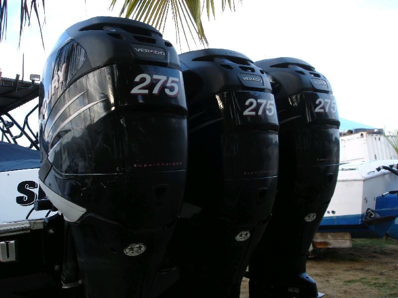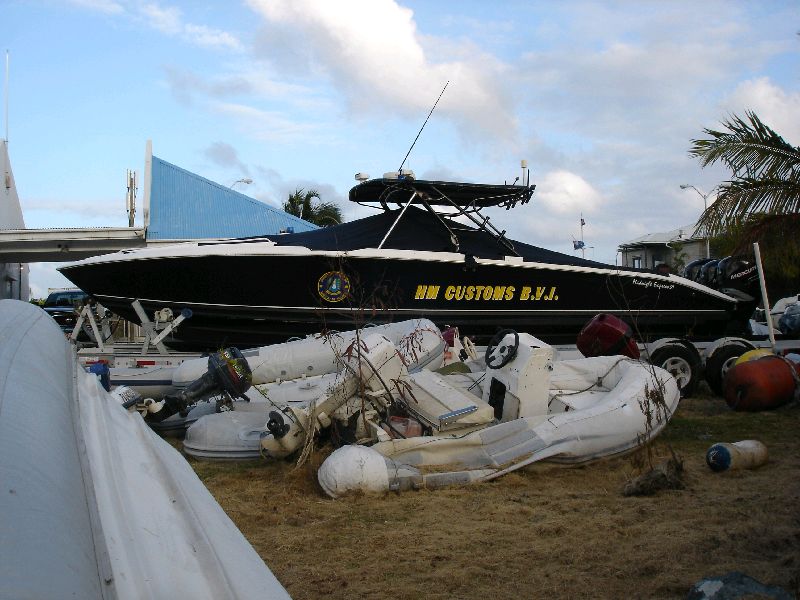 Road Town, Tortola, BVI, Westindies. Wahrscheinlich die Nähe zur US Grenze. Keine Ahnung, was es da zu schmuggeln gibt. Dieses Zollboot hinter den alten Schlauchbooten ist etwa 8 m lang und hat 825 PS. Ganz flott. Sea u Bert