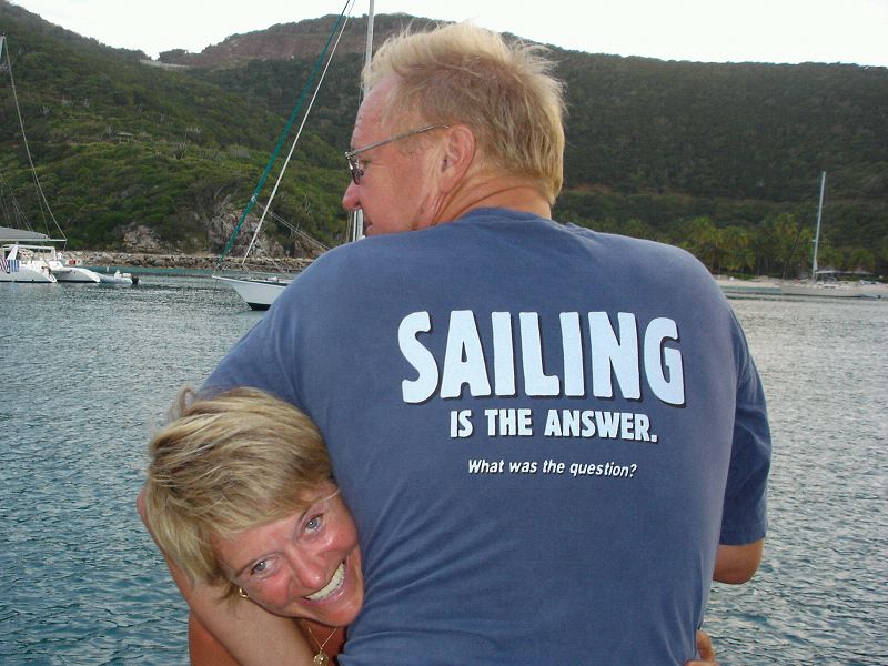 Saint Thomas Bay, Virgin Gorda, BVI, Westindies. 6047 Seemeilen seit Oberndorf. Die BVI’s (British Virgin Islands oder Jungferninseln), die wir nach einer durchsegelten Nacht erreicht haben, stellen sich als die Meister der Bürokratie vor. Mehr Formulare musste ich nie ausfüllen. Da wir über 30 Tage im Land bleiben (wegen unseres Osterspaziergangs nach Oberndorf) muss Heimkehr für ein Jahr importiert werden, was 200 US Dollar Gebühren oder Zoll kostet. Dafür ist das Wasser supertürkis, und wir hatten heute morgen eine Riesenschule springfreudiger Delphine vor dem Schiff. Jetzt geht’s weiter in eine andere Bucht. Da liegt der Bitter End Yacht Club. Den müssen wir sehen. Sea u Bert_____/)_____