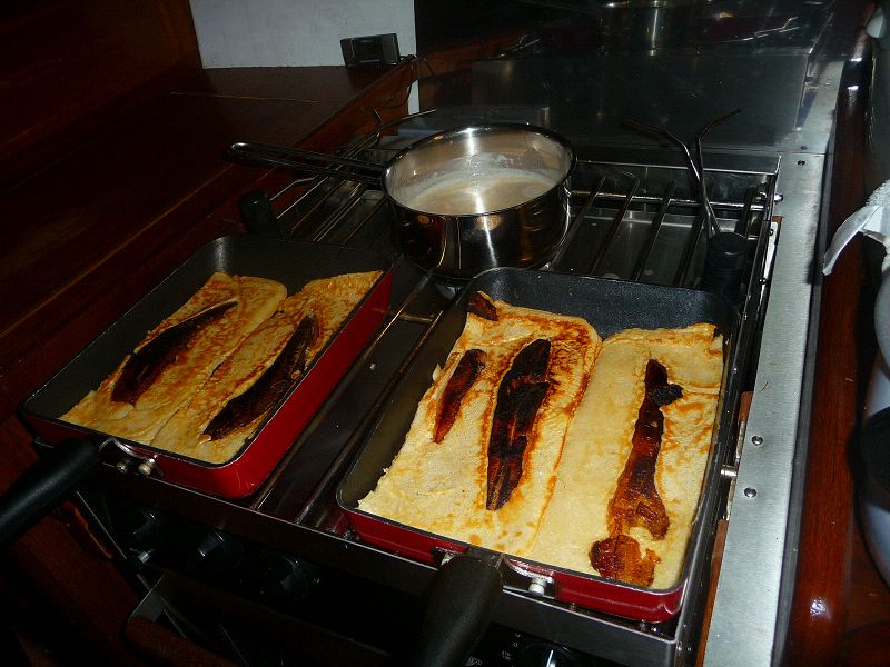 Statia, Westindies. Gestern per Kurzwelle bekamen wir von MOMOs Hochseegourmet-Köchin Brigitte, zur Zeit auf den San Blas Inseln bei Panama, folgendes Pfannkuchenrezept: Zwei Plantain (tja, ihr zu Hause, die gibt’s bei Euch nicht, Pech gehabt) in Scheiben oder längs geschnitten anbraten, Pfannkuchenteig drumherum gießen und fertigbraten, dazu eine leichte Kokossoße aus ca. 17 prozentiger Kokosmilch mit einem Schuss Ahornsirup oder Honig. Zucker und Zimt … fertig und lecker. Plantain ist ein bananenähnliches Gemüse, schmeckt aber nicht bananensüß. Wird hier sehr gerne in Curries verwendet. Grüße aus der HEIMKEHR-Küche an die MOMO-Küche.