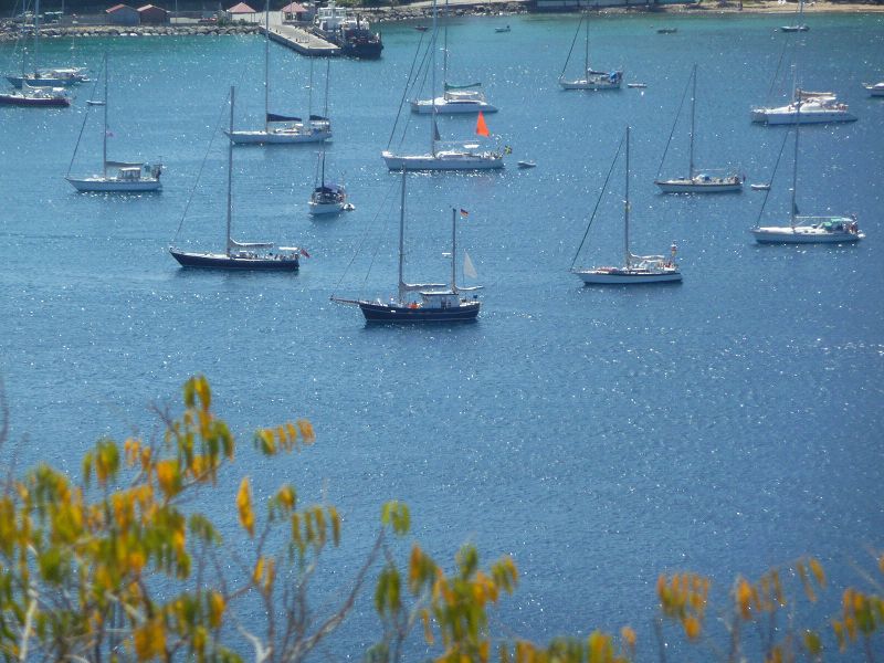 Port Louis, Gouadeloupe, Westindies. 5748 Seemeilen seit Oberndorf. Etwas südlich vom Hafen, der für uns zu flach wäre, liegen wir vor Anker. Haben das Dorf besucht. Siehe oben. Nichts los, ist allerdings Karneval. Alles zu. Morgen geht’s weiter nach Antigua. SuAn treffen wir wieder auf dem Weg dahin. Sea u Bert