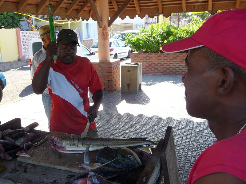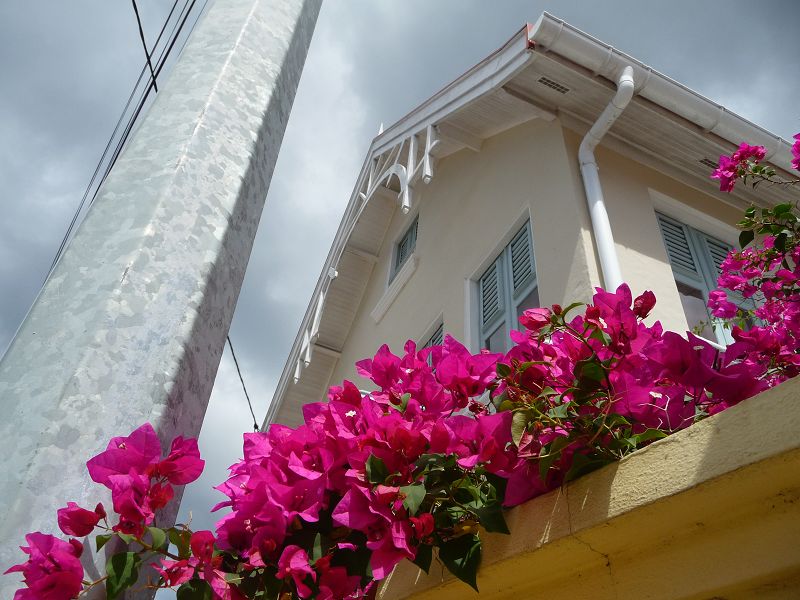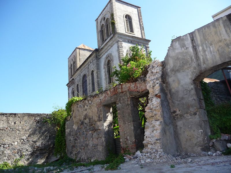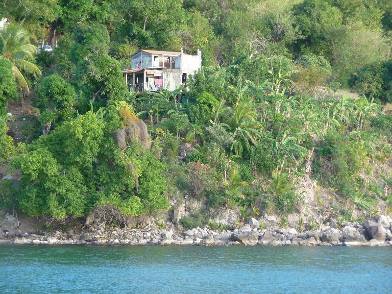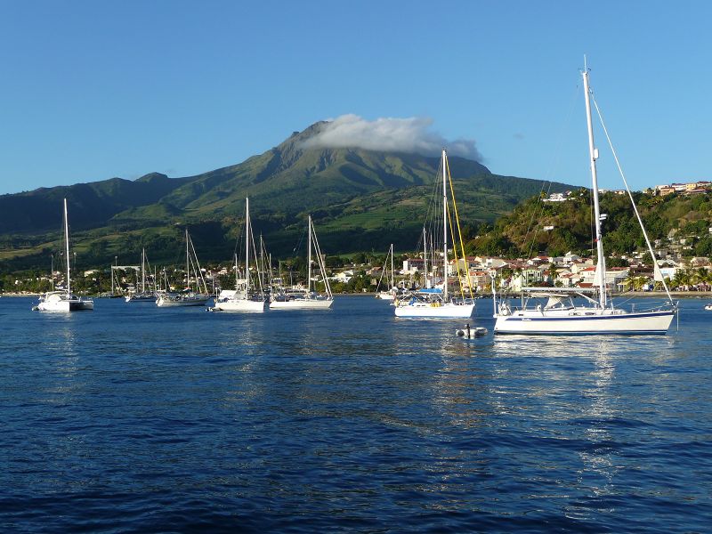 Vor Anker, St. Pierre, Martinique. Dieser schöne Berg ist nicht so nett, wie er aussieht. Bis zum 8. Mai 1902 war St. Pierre das blühende Zentrum der Karibischen Inseln. Morgens um 8.02 Uhr explodierte der Vulkan Pelee zur Seite und eine extrem heiße Gaswolke tötete 30.000 Menschen. Die Stadt war völlig zerstört. Einziger Überlebender war Cyparis, ein in einer gemauerten Zelle inhaftierter Mörder. Die Zelle mit rundem Dach war so stabil gebaut, dass sie der Hitze standhielt. Trotz der weiter drohenden Gefahr durch den Vulkan wurde ein großer Teil der Stadt auf den alten verkohlten Mauern wieder aufgebaut. Uns gefällt diese Stadt, weil wenig touristisch und eine gute karibisch-französische Mischung. Sea u Bert_____/)____