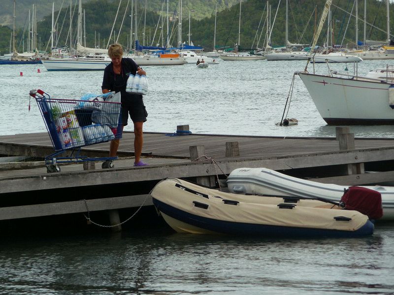 Le Marin, Martinique. So haben wir es gern. Ein kleiner ordentlicher Supermarkt mit eigenem Anleger. Einkaufswagen direkt zum Beiboot. Hier gab es viele europäische Waren, Käse z.B. Allerdings auch örtliche Spezialitäten wie eingelegte Schweinenasen, auf die wir verzichtet haben. Sea u Bert____/)___