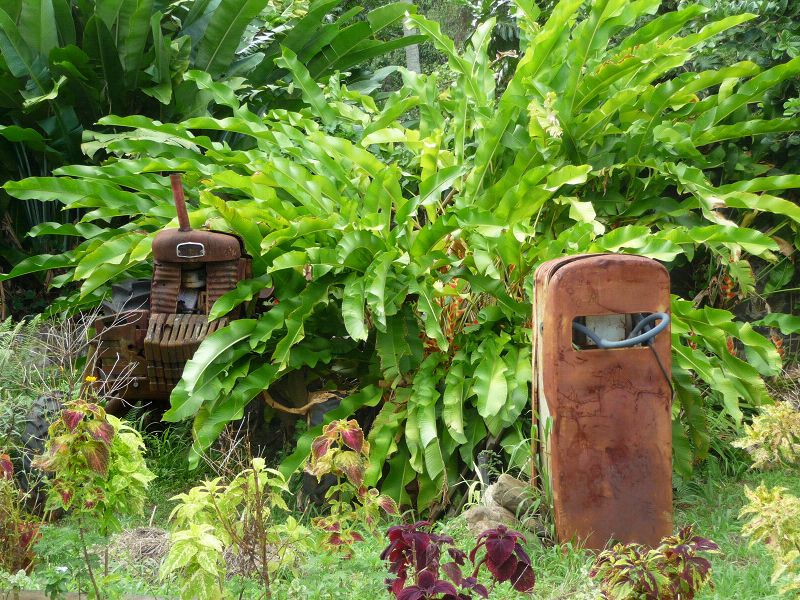 Hinter der Palmen-Chaussee holt sich die Natur auch den Trecker mitsamt Tankstelle zurück.