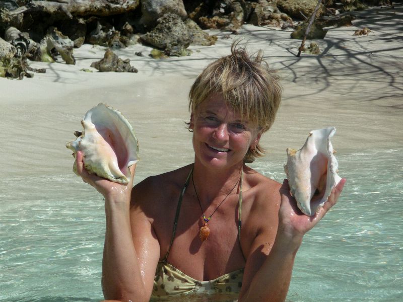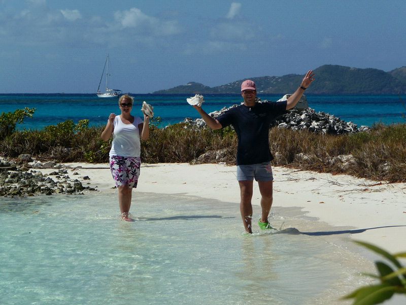 Tobago Cays. Es ist wirklich so türkis wie auf den Fotos. Die Tobago Cays sind ein paar Inselchen und Riffe, zwischen denen man ankern kann. Das tun auch ganz viele. Wir haben mit den Kindern einen Mini Strand entdeckt, voller großer Conch Muscheln. Da gerät Leni in Verzückung. Sea u Bert