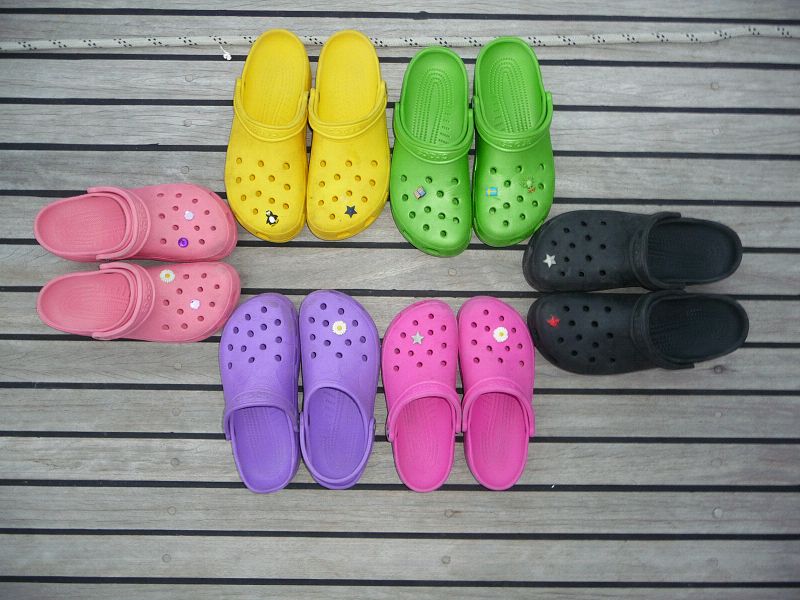 Immer ein Paar für an Bord und ein Paar für an Land. Die teuren Lederdinger aus dem Yachtausrüstungsladen haben Sohlen, die aushärten und immer glatter werden. Wir lieben unsre Crocs, die rutschfestesten Bordschuhe, die wir je hatten.