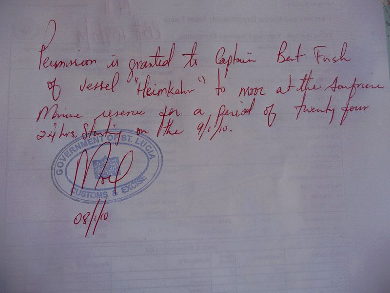 Rodney Bay, St Lucia, Karibik. Schön aber weit von Oberndorf. Endlich waren wir mal wieder draussen vor Anker. Gleich werden wir ankerauf gehen und an der Küste Lucias entlang nach Soufriere segeln. Das ist der berühmte Marine Park mit den zwei Spitzbergen. Für dieses Gebiet braucht man und Frau eine Sondergenehmigung, die uns der Customsoffizier per Hand ausgestellt hat. Sea u Bert ____/)____