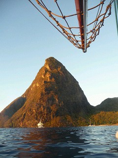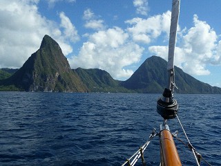 Soufriere, St. Lucia. %372 Meilen seit Oberndorf. Über Kurzwelle. Fünf Stunden herrliches Segeln im Schutz der Insel. Jetzt liegen wir an einer amtlichen Mooring zwischen den Pitons. Das sind zwei Spitzberge, die das Wahrzeichen des Staates sind. Die beiden Berge sind je 2500 Fuß hoch. Ein wunderschöner Platz. Sea u Bert____/)____