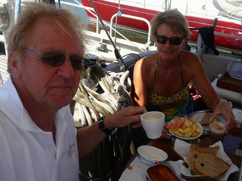 Was ein Seglerpaar um die 50 so braucht: Frische Früchte, der Obstmann kommt jeden Morgen mit dem Boot, Heringsfilet in Tomatensoße, selbstgebackenes Cranberrybrot und endlich wieder ein richtiger Cappuccino.