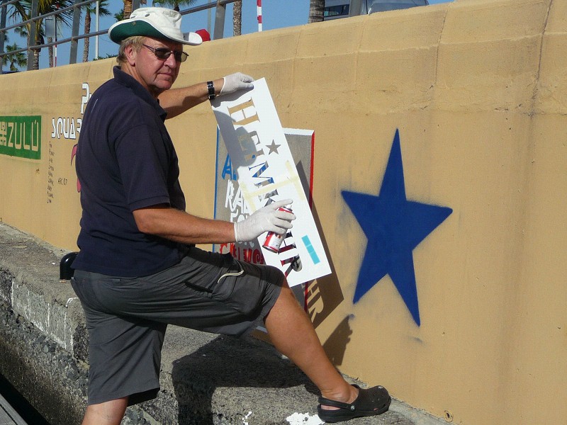 Wie an den ostatlantischen Häfen üblich, haben wir auch hier in Las Palmas unseren Fußabdruck hinterlassen. Mit Schablone ging’s diesmal schon viel schneller. Seht hier die Künstler bei ihrer schweren Arbeit.