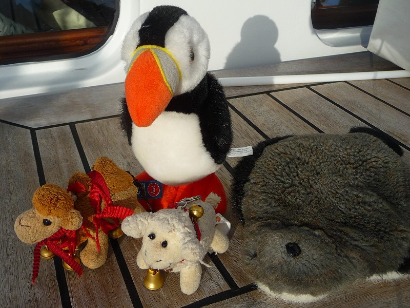 Maskottchen und hochseefähige Glücksbringer gibt’s wohl auf allen Schiffen. Bei uns fährt seit den Shetlands Paula Puffin mit. Fischkuttermäßig angepasst, außer ihr noch eine Scholle namens Butt. Ja und nebenan auf Cisa eben Trudy, das Kamel. Ach so, da gibt’s auch noch ein Schaf, das heißt Schaf. So sieht’s auch aus. Sea u Bert____/)____