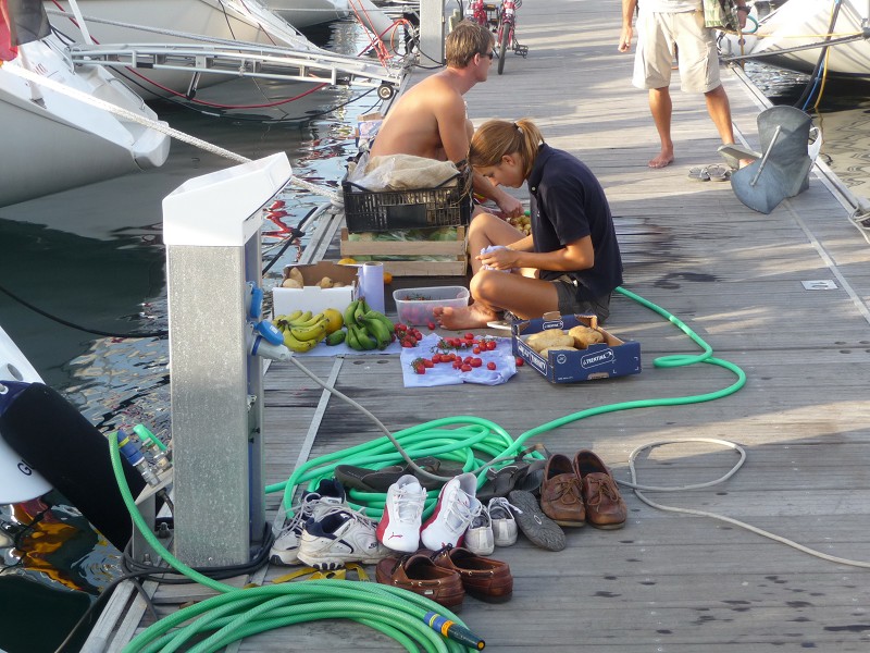 Morgen ist Ausklarieren und Skipperbriefing. Da gibt es eine eingehende Wetterberatung und viele andere Informationen. Dann wollen wir noch unseren Stern an die Hafenmauer malen. Heute gabs nochmal Proviant, wir waren schon um 8 Uhr auf dem großen roten Gemüsemarkt und Leni hat noch eine Fuhre Panikkäufe geholt. Wir haben jetzt fast alles verstaut und sind nicht mehr nervös. Das Schiff ist gut ausgerüstet, die Crew fröhlich und entschlossen. Na denn man los.