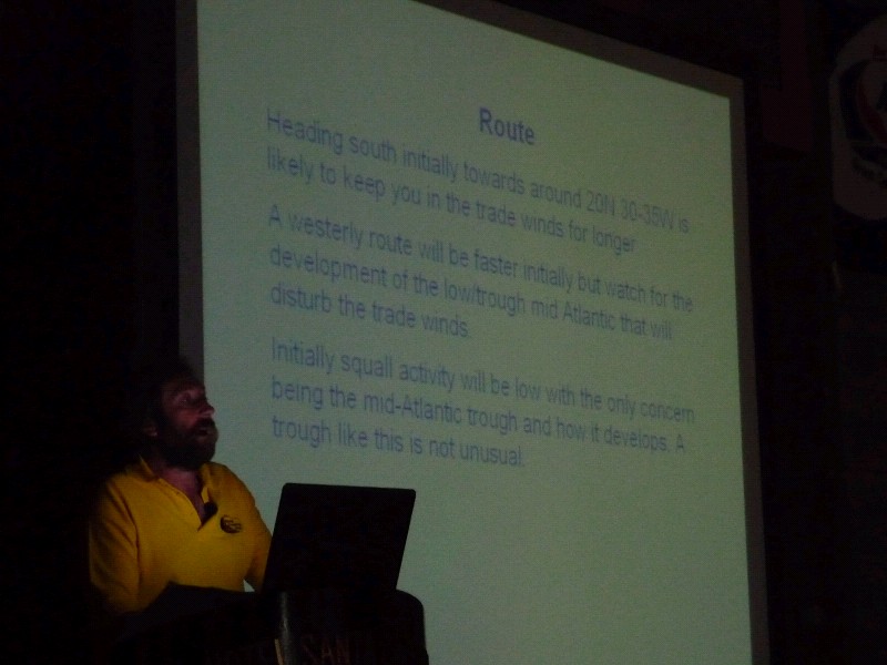 Heute mussten alle Skipper zum Briefing. Da gings ums Wetter und die möglichen Routen, abermals um Sicherheit und die Funkerei. Jedes Schiff muss einmal täglich die Mittagsposition melden. Das geschieht per E-Mail oder Satphone. Bei uns hat sich das Mailen über Kurzwelle bewährt. Das Wetter ist gut vorhergesagt, Chris (der mit dem Bart) ist ein erfahrener Wetterfrosch. Beindruckend, die ganzen Skipper artig auf der Bank sitzen zu sehen. Irgendwie waren die heute alle ruhiger als bei den Seminaren…
