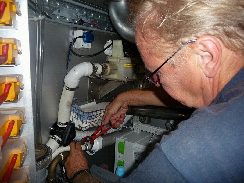 Serie über den Alltag an Bord. Heute: Seewasserzuleitung Wassermacher leckt. Im Steuerbord-Maschinenraum ging der Bilgewasseralarm los. Das ist ein einfacher Wassermelder von Conrad, der Geschrei macht, wenn Wasser da ist. Der Wassermacher hat so Steckverbindungen, die ich noch nie toll fand. Wieder reingesteckt. Fertig. Wasser aufgesaugt. Nichts schlimmes, auch nicht bei 45 Grad im Maschinenraum.