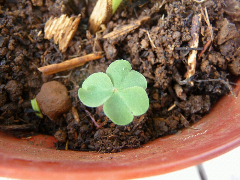 Unser Basilikumwald fühlt sich nach der Wurmkur deutlich wohler. Und nun wächst am Rande dieses kleinen Waldes ein Kleeblatt!! Glücksklee eben.