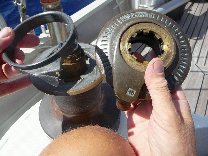 Serie über den Alltag an Bord. Heute: Winsch kaputt. Plötzlich und unerwartet bricht der Ausführring der Backbordschotwinsch. Keine Ersatzteil an Bord. Wir können uns mit einer Umleitung auf die Zentralwinsch helfen. Vor dem größten Teil unserer Reise muss das Ding aber wieder funktionieren. Also Erstzteil muß her, Zack, zack.