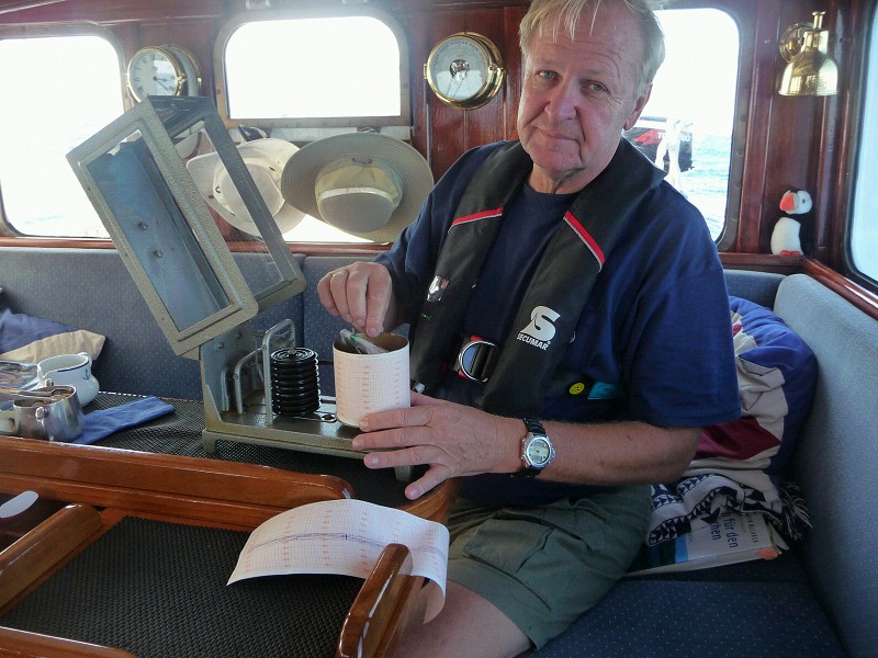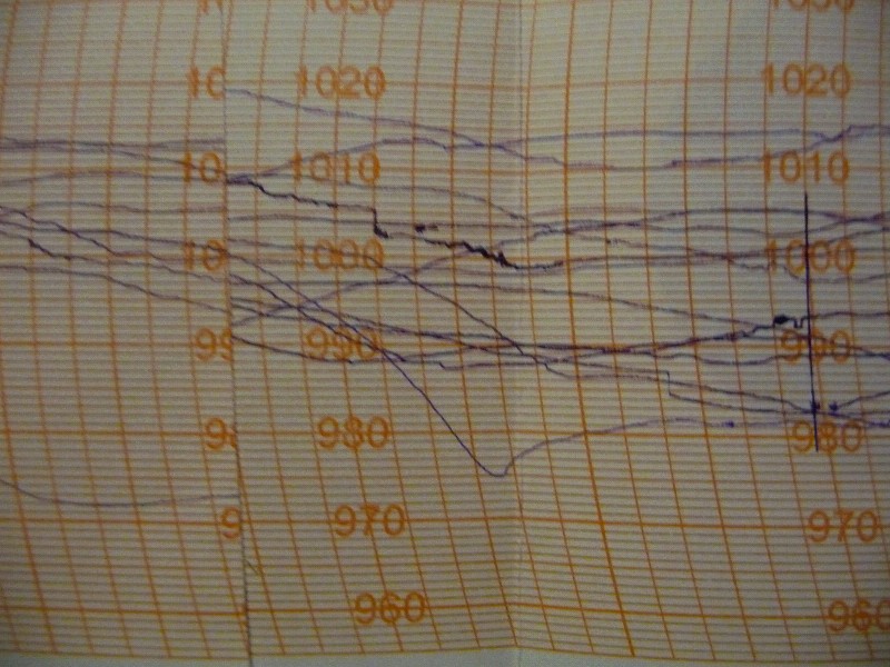 Serie über den Alltag an Bord. Heute: Barografenstreifen wechseln. Trotz aller Elektronik ist ein Barograf ein unentbehrliches Utensil an Bord. Ein guter Freund hat ihn uns geschenkt. Dieses Gerät schreibt mit einer Undrehung pro Woche die Veränderungen des Luftdrucks auf. Die Tendenzen lassen Rückschlüsse auf die Wetterentwicklung zu, warnen so vor nahenden Stürmen. Nach zwei oder drei Wochen bzw. Umdrehungen wechseln wir den Papierstreifen. Das zweite Bild zeigt einen steilen Zahn,den tiefsten Stand, den wir im letzten Jahr aufgezeichnet hatten. Da waren wir im Oktober in der Nordsee auf der Flucht vor einem Sturm, der prompt drei Stunden nach unserem Einlaufen nach Helgoland eintraf. Der steile Absturz des Druckes war ein sicheres Zeichen.