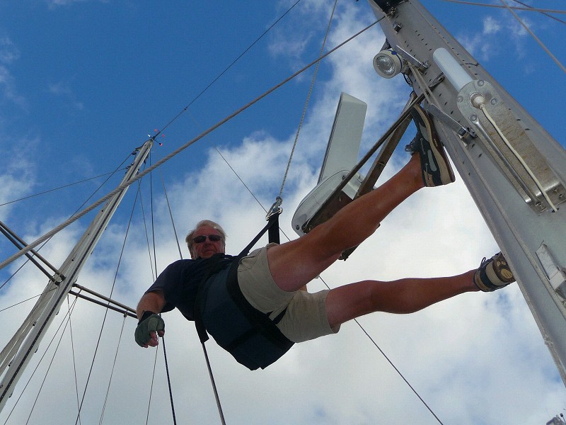 Serie über den Alltag an Bord. Heute: Radarreparatur. Das Bild zeigt den Skywalker. Ein schwer zu findender Fehler. Manchmal geht beim Start der Radarantenne das ganze System aus. Auf’s Radar sind wir im Atlantik in hohem Maße angewiesen. Ich will den Antriebsmotor der Radarantenne austauschen. Nicht so einfach da oben.