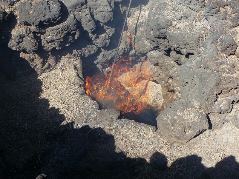 Im Vulkan Nationalpark führt ein Ranger vor, wie heiß der Berg immer noch ist. 185 Jahre nach der letzten Eruption beträgt die Temperatur in 10 m Tiefe noch 400 Grad. Ein Eimer Wassr vom Ranger ins Bohrloch geschüttet, schießt explosionsartig wieder heraus. Ein Reisigbündel fängt in einer nur 2 Meter tiefen Grube sofort Feuer. Klar, dass im Parkrestaurant die Hähnchen über einem Vulkangrill gebraten werden.