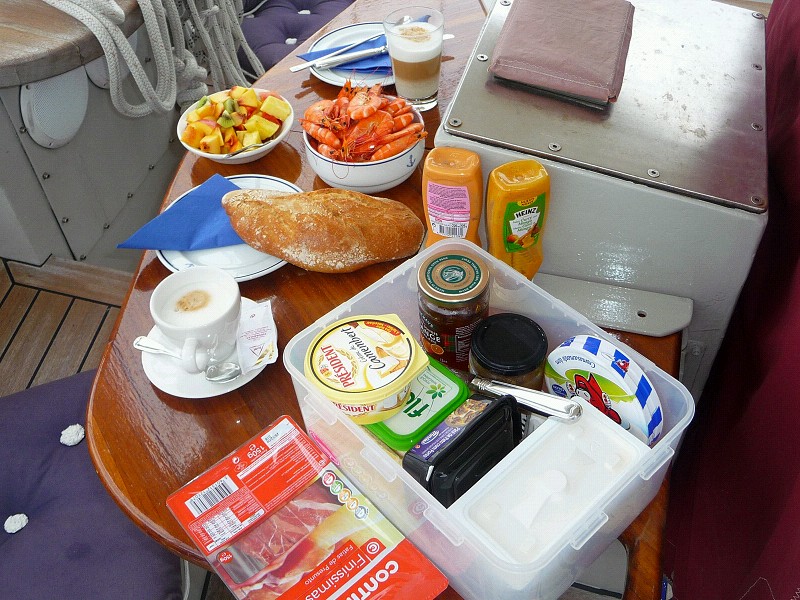 Serie über den Alltag an Bord. Heute: frühstücken. Klar, Frühstück ist die schönste Tageszeit. Gern auf dem Achterdeck, wenn wir vor Anker liegen, weil dort Windschutz (Lee) ist. Die Bank hinter dem Ruderhaus nennen wir, weil unter der Nationalflagge, die ‘Deutsche Bank’. Es gibt entweder, wenn vorhanden, Brot mit Wurst, Fisch, heute auch Krabben, Käse und Marmelade (die nur für Leni), oder Müsli aus Cuxhaven mit Früchten.