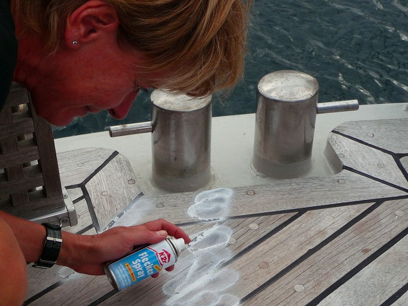 Serie über den Alltag an Bord. Heute: Fleck an Deck. Ein Holzdeck ist überaus empfindlich gegen Fettflecken. Eigentlich bleiben die ein halbes Jahr. Deswegen bleiben die Landschuhe an Land. Krümelkuchen sind verpönt. Wer Fettflecken aufs Deck macht, wird üblicherweise aufgehängt. Aus dem Megayachtbereich bekamen wir den Tip: K2R Fleckenspray. Wisst Ihr noch: Der Fleck geht weg, ganz ohne Rand!. Na morgen sehen wir mal. Übrigens der Fleck stammt von mir. Zum Aufhängen war ich zu schwer, das musste ich aus Gründen der Arbeitssicherheit ablehnen.