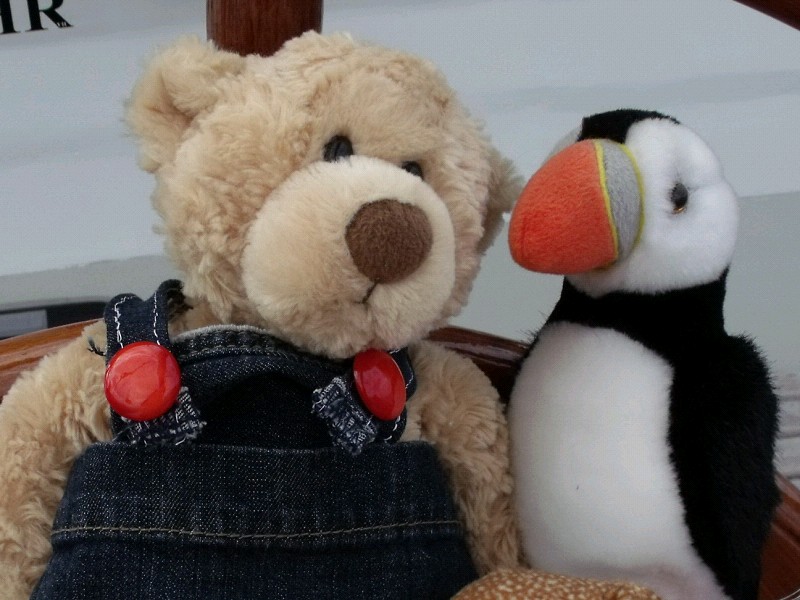 Dieser ziemlich lebendige Jungbär heißt Winston und ist Teil der Crew von ‘SPRUCE’. Hier bei einem Besuch auf Heimkehr, im intensiven Gespräch mit Paula Puffin, die seit den Shetlands bei uns mitsegelt.