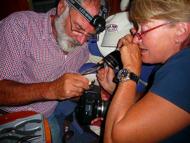 Marlene wollte es nicht einsehen. Eine feine Kamera, 3 Jahre alt, in den Schrott, nur weil ein winziges Kontaktbeinchen verbogen ist? Rainer von ‘Lojan’ auch nicht. Sie haben es hingekriegt. Unter anderem mit einem kleinen Haken, gefertigt aus einer abgeflexten Segelnadel. Nun funktioniert sie wieder und kann feine Bilder für die Website machen. Sea u Bert _____/)____