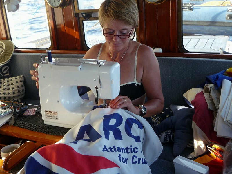 Wenn dann auf hoher See sonst nix zu tun ist, holt Marlene ihre Aldi-Nähmaschine aus der Backskiste und repariert: die eingerissene Hose, den aufgerissenen Reißverschluss, das Knopfloch am Sonnenschutz und die Flaggen. Die Deutschlandflagge am Besahnmast wird immer besonders strapaziert. Sie ist, da wir ja nun in jedem Land ein ausländisches Schiff sind, immer gesetzt, Tag und Nacht. Die Gastlandsflaggen, unter der Steuerbord-Saling gesetzt, leiden etwas weniger. Auch die Nähte unserer ARC-Flagge, die jedes Schiff bekommen hat, dass an dieser Reise über den Atlantik teilnimmt, müssen nachgenäht werden. Diese Flagge setzen wir im Hafen. Das machen alle anderen Schiffe auch und so lernt man schon mal die Mitstreiter kennen. Und in vielen Häfen zahlen wir als Teilnehmer dieser Regatta reduziertes Hafengeld. Das ist doch mal was! Damit die Nähmaschine läuft, muss allerdings der Inverter den Strom liefern. Hier kommen die 230 V zwar auch aus der Steckdose, aber nicht so einfach wie zu Hause. Da müssen aus den vorhandenen 24 V erstmal 230 V gemixt werden. Und wie das geht, das verraten wir später mal.