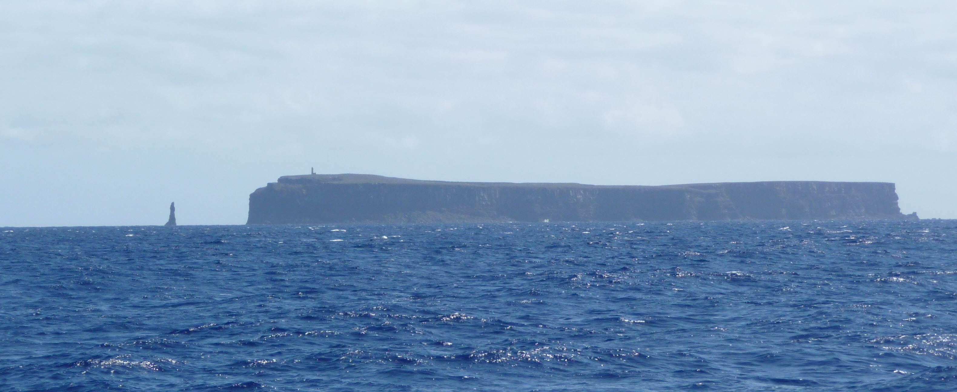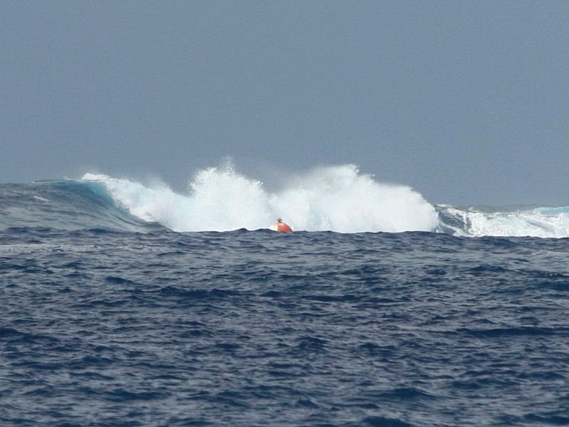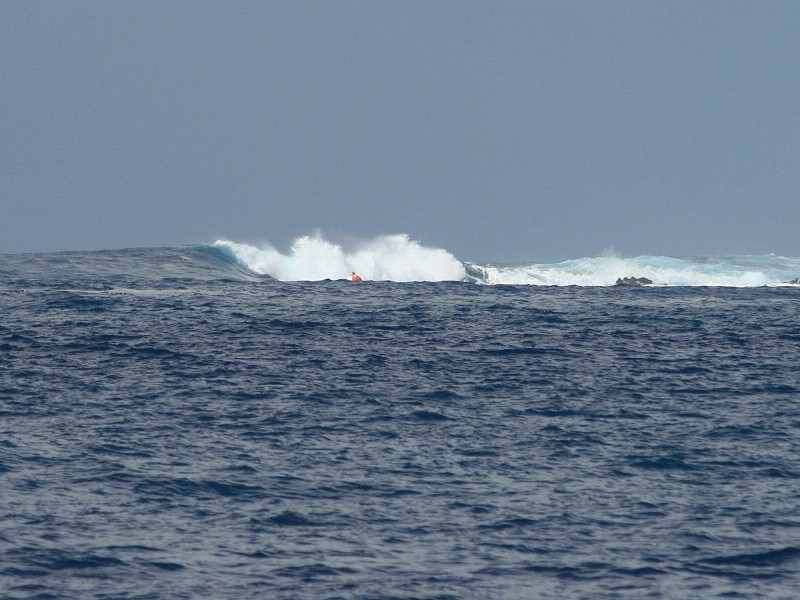 Ilhas Selvagens, Atlantik. Dieses ist der vorgesehene Ankerplatz, dem wir uns ganz vorsichtig nähern. Das kleine rote Ding in der Mitte ist die Mooringtonne für das Versorgungsschiff. Da sollten wir eigentlich ran. Das haben wir lieber gelassen. Zum Größenvergleich: Sie hat einen Durchmesser von etwa 2 Metern.