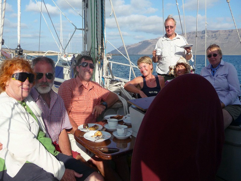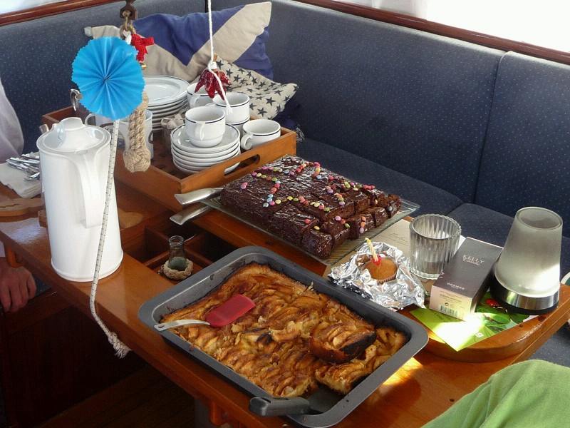 Lenis Geburtstag hatte von allem etwas. Morgens kamen schon die Nachbarn mit ihren Dinghies angesaust und sangen nacheinander in englisch, deutsch, holländisch und spanisch. Daphne von ‘Lojan’ hatte schon einen Kuchen gebacken und Leni und ich auch einen ‘Oberndorfer Apfelkuchen’. Dann sind wir zu sechst auf den 177 m hohen Vulkan gestiegen, der gleich neben unserer Ankerbucht aufragt. Nachher natürlich gemeinsamer Geburtstagskaffee. Toll, wie sich so ein internationaler Freundeskreis zusammenfindet.