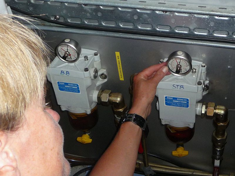 Serie über den Alltag an Bord. Heute: Kraftstofffilter (irgendwie doof mit drei f) prüfen. Machen wir einmal pro Wache, ein Blick auf die Unterdruckmesser, auf deren Wert man auf die Filterverschmutzung schließen kann. In den unteren Schaugläsern kann man oder Frau Wasser und grobe Verschmutzungen erkennen.